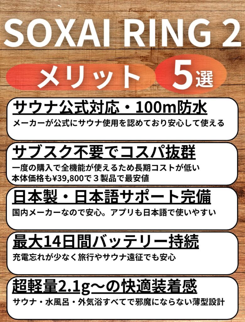 - SOXAI RING 2:日本製・サウナ公式対応・サブスク不要・バッテリー14日間。コスパ最強でサウナーに最もおすすめ!