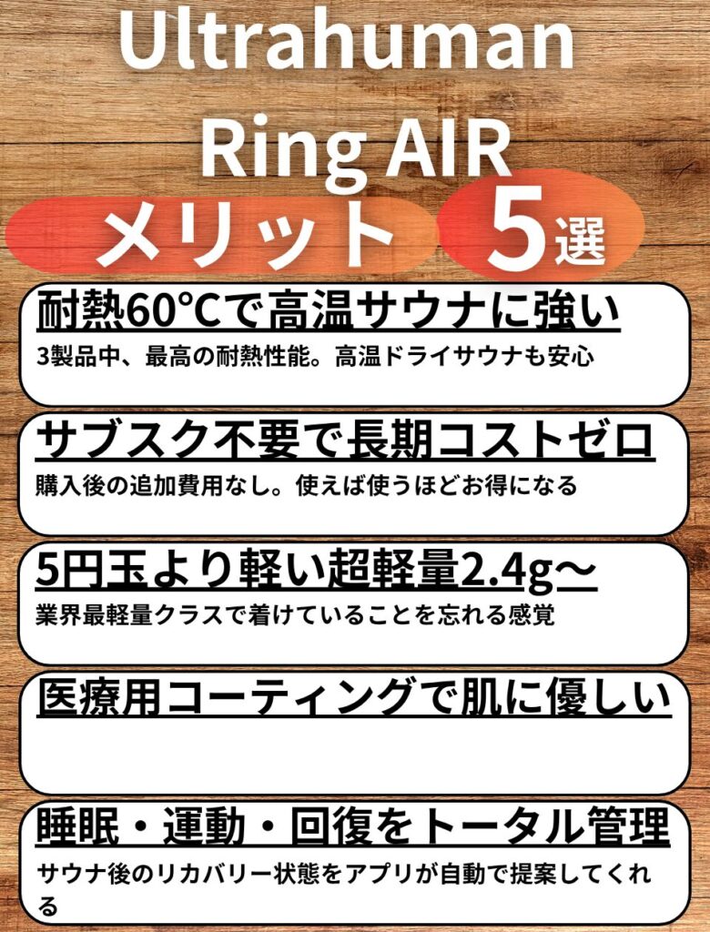 - Ultrahuman Ring AIR:耐熱60℃で高温サウナに最強。サブスク不要・超軽量設計(59,799円)。